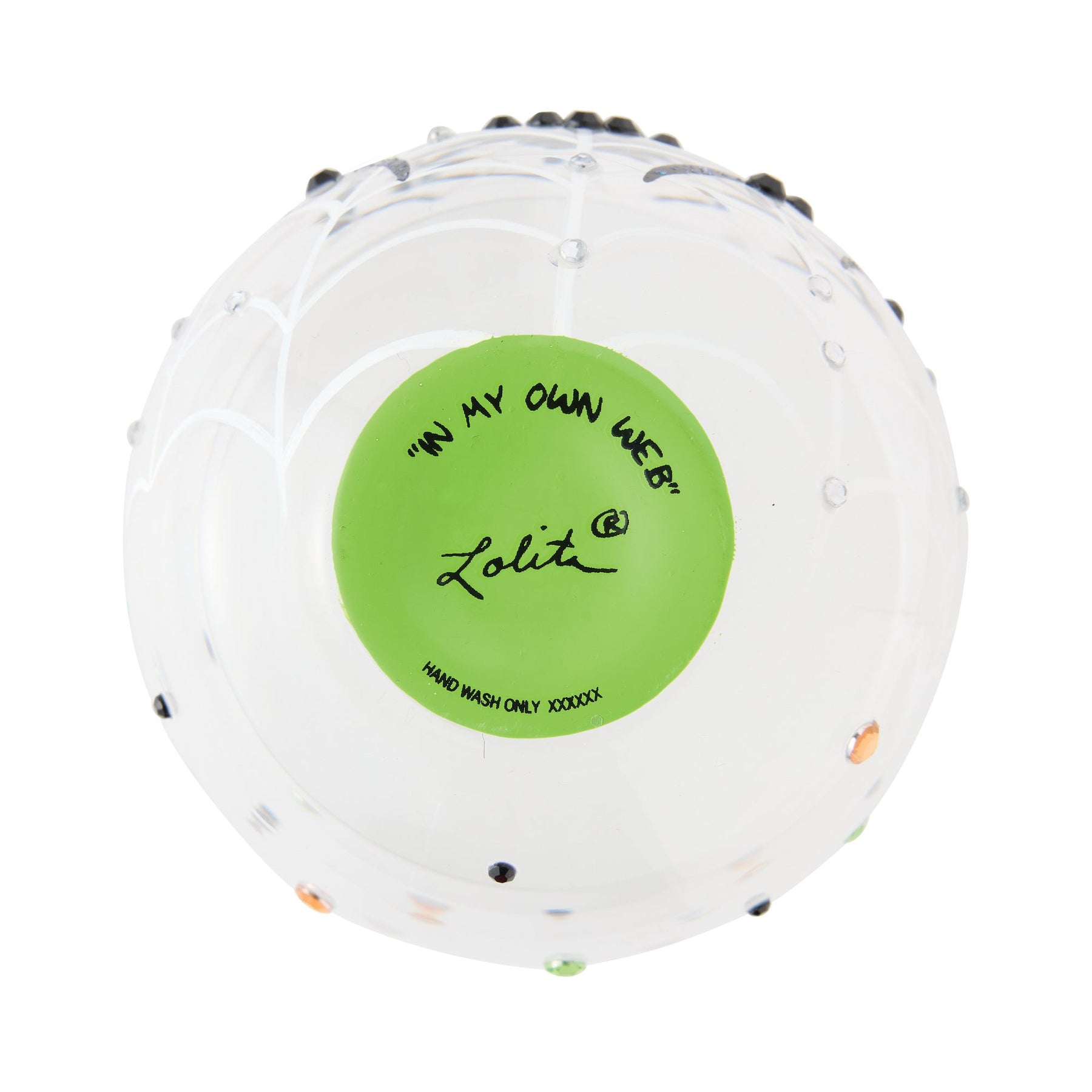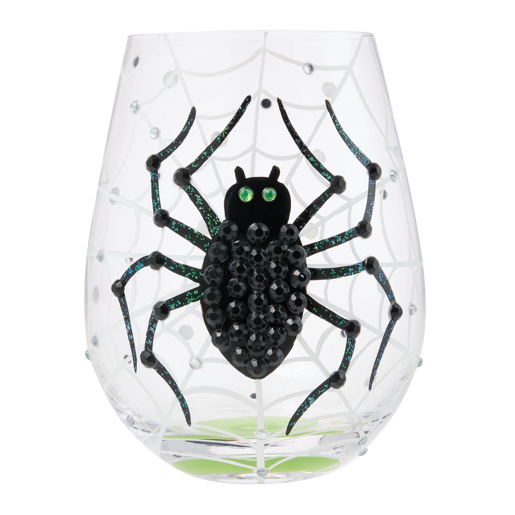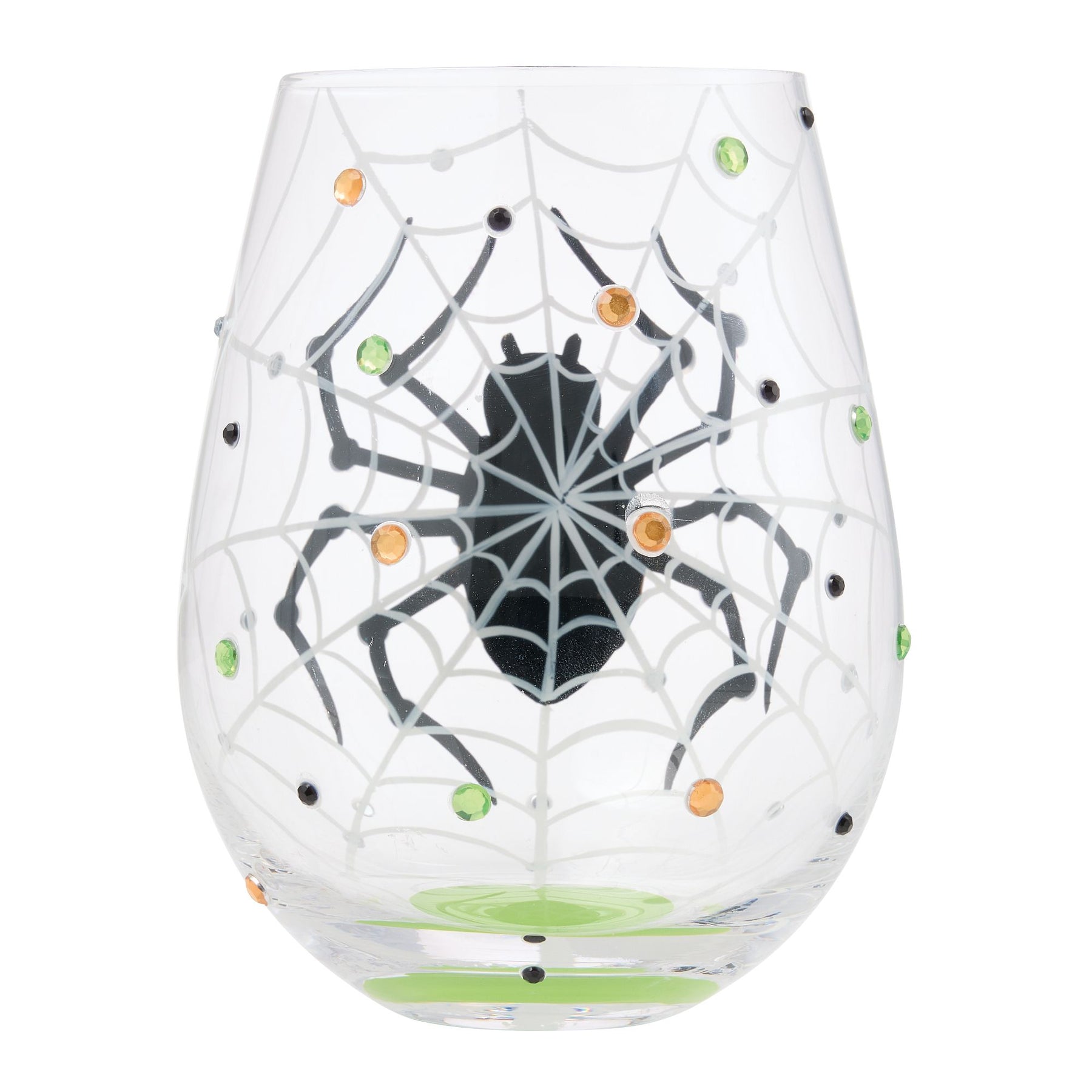 This stemless wine glass from Lolita spins a spooky good time with green and orange rhinestones and a fabulous black spider weaving a web. Itsy Bitsy Tipsy, this glass is hand-painted for a wickedly fun time!