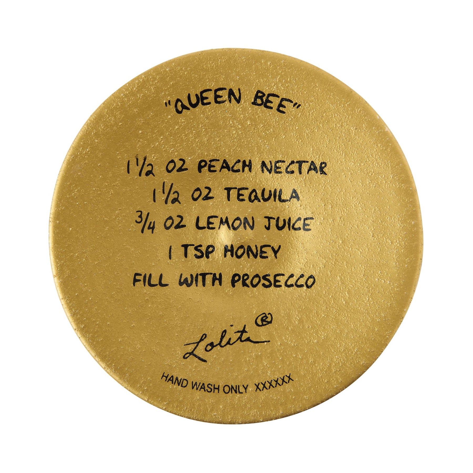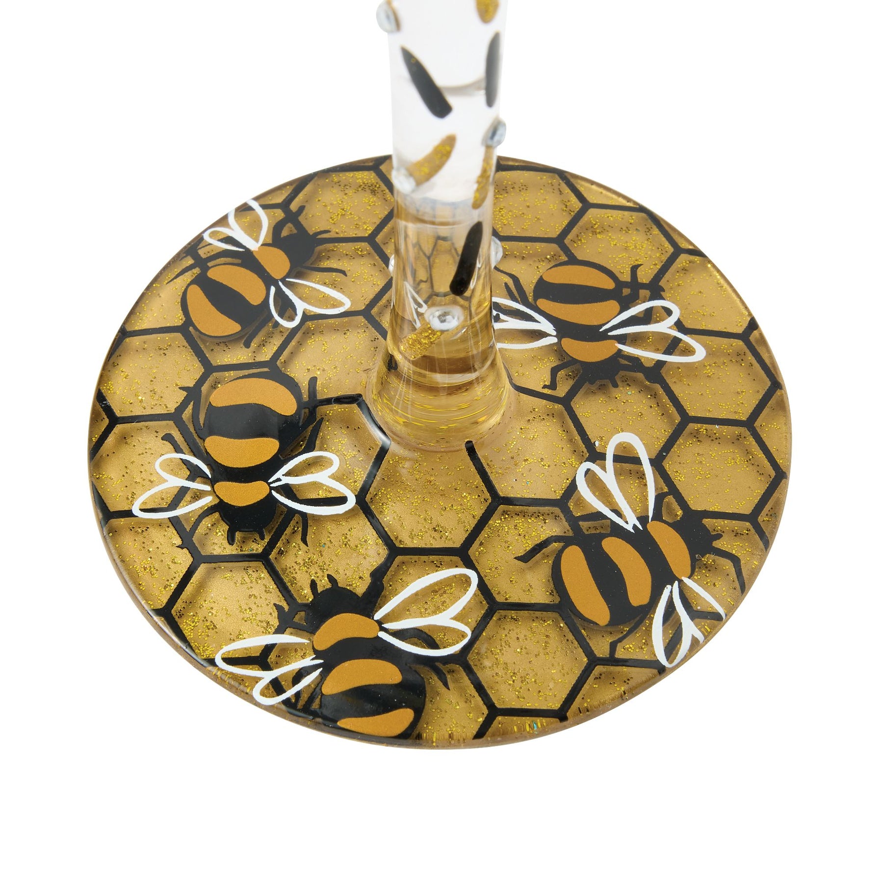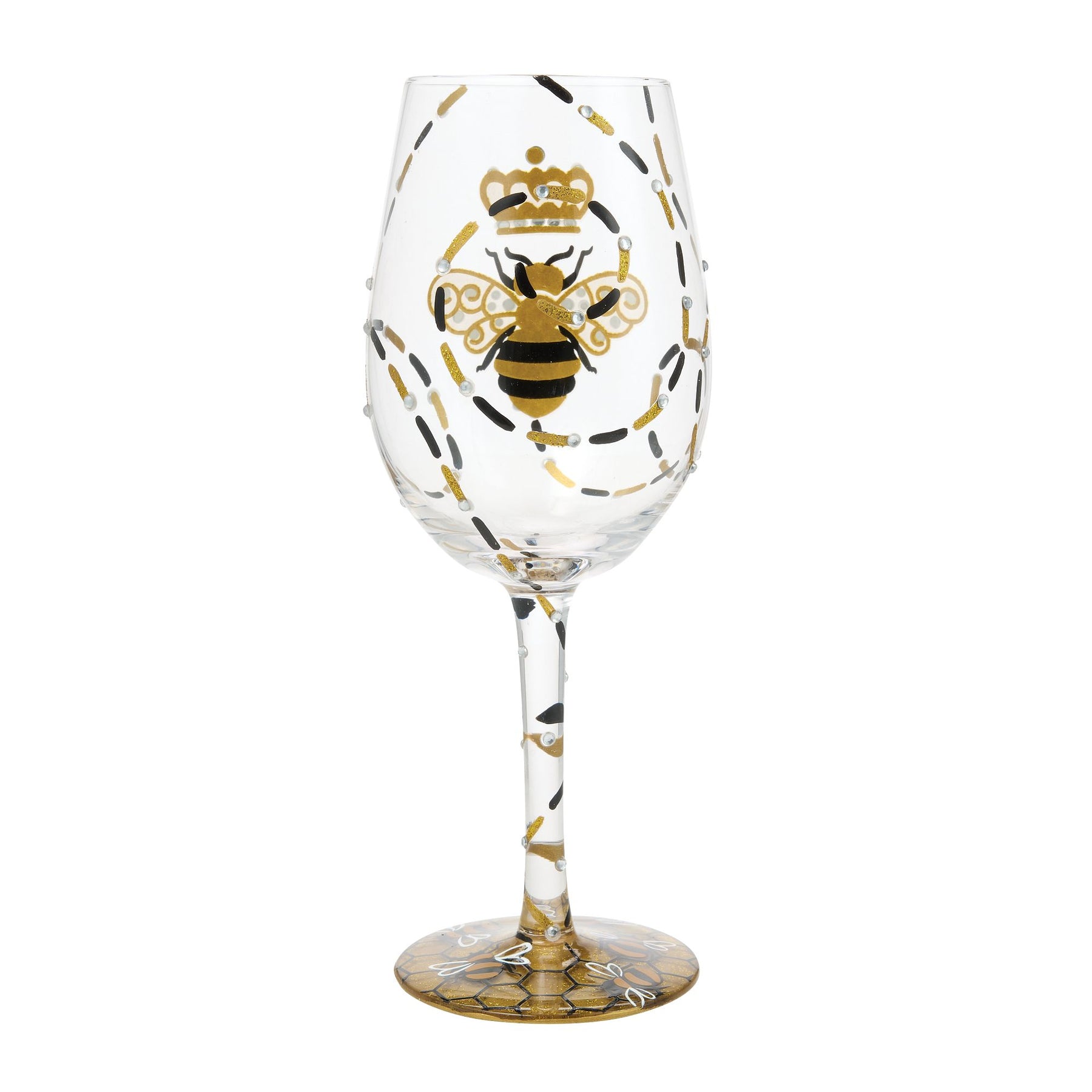 Fit for a queen, this golden wine glass from Lolita is buzzing with charm! Featuring a honeycomb pattern, sparkling rhinestones, and a regal queen bee, it's hand-painted with sweet detail. A honey-inspired drink recipe invites a stir!